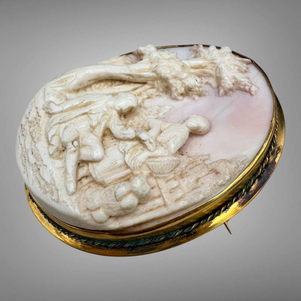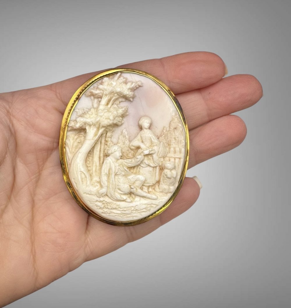 Antique hand-carved shell cameo brooch set in 18 karat yellow gold frame. Highly detailed cameo depicts outdoor family scene with a dog.