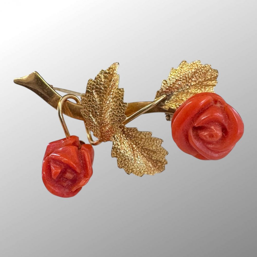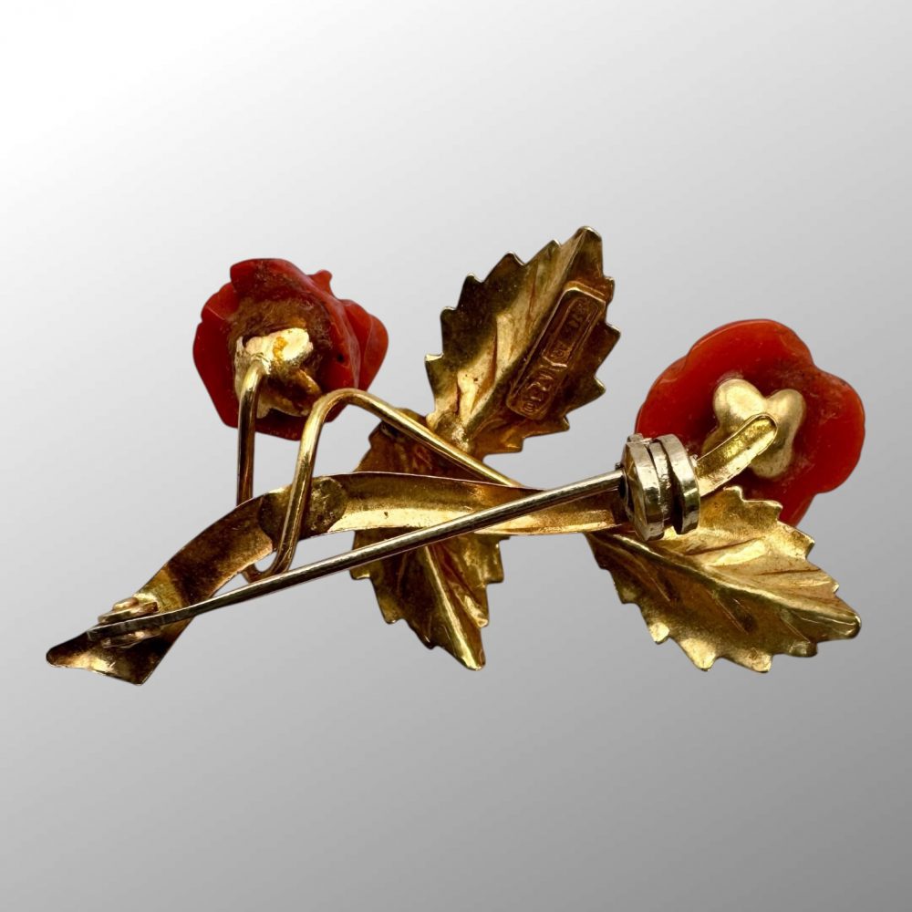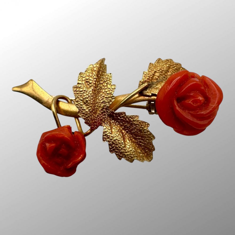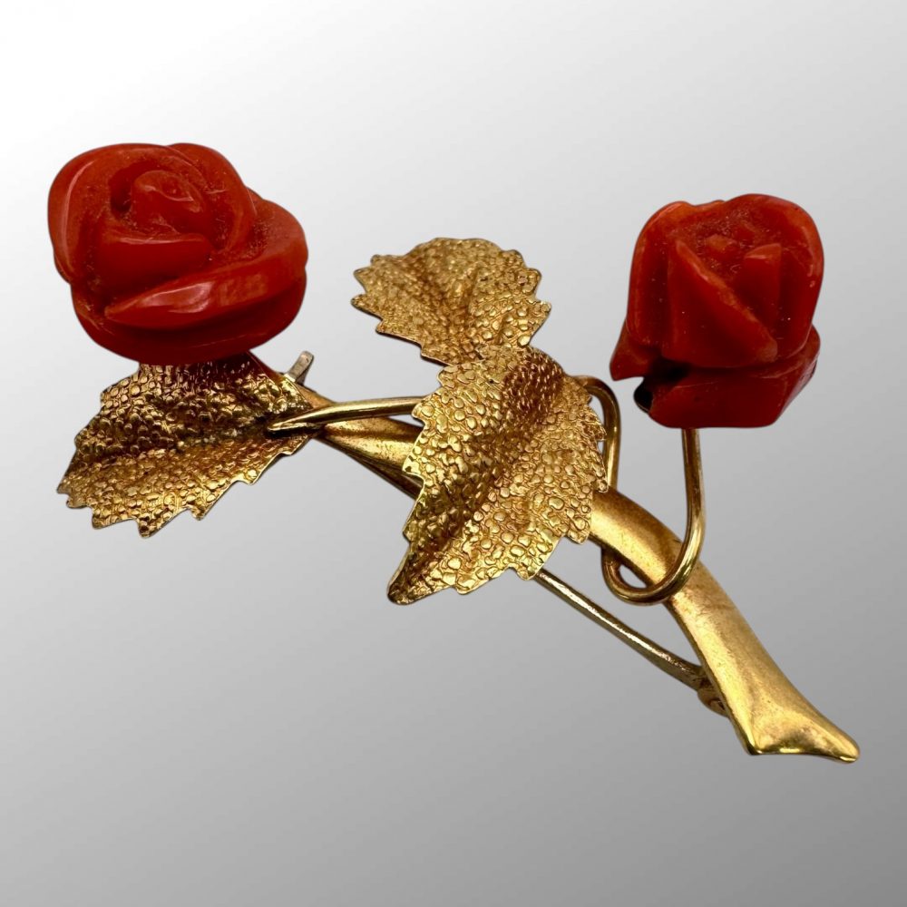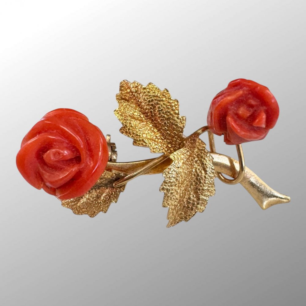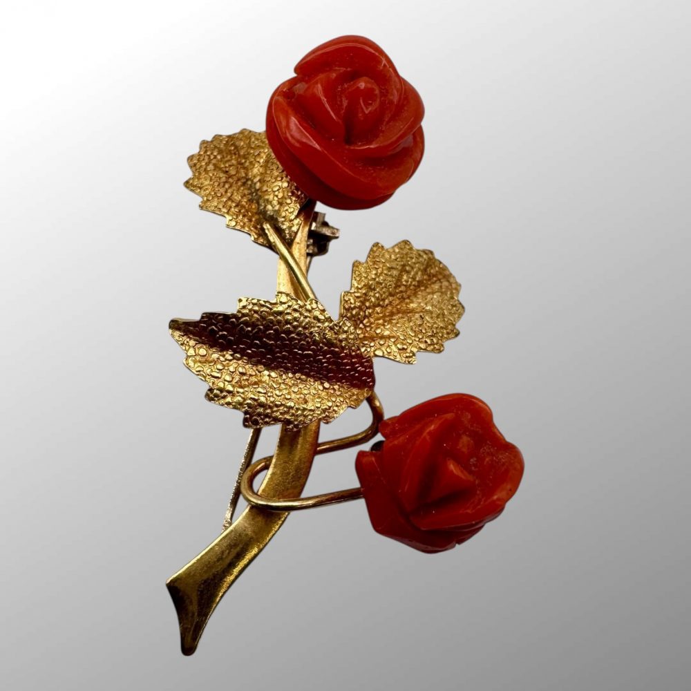 This beautiful retro brooch features two carved red coral rose flowers and detailed sand cast leaves. Pin with roll over safety lock to the back.
