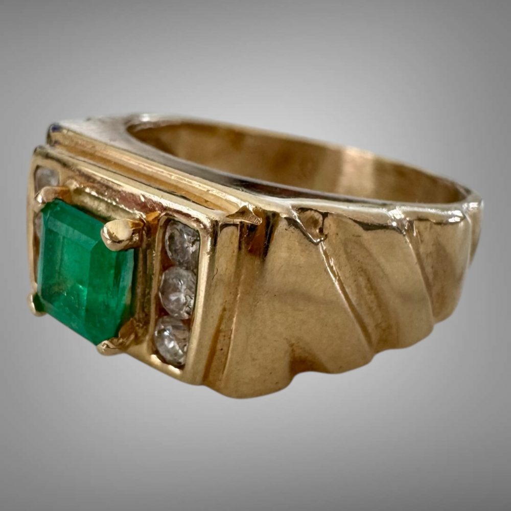 A striking gentleman’s 14K yellow gold ring featuring a square step-cut emerald of vivid green color, flanked by six round brilliant-cut diamonds-three on each side-set within rectangular panels. The ring displays a bold, architectural design with diagonally fluted shoulders and a solid, substantial band. Classic mid-to-late 20th century styling, presenting a robust yet elegant presence on the hand.