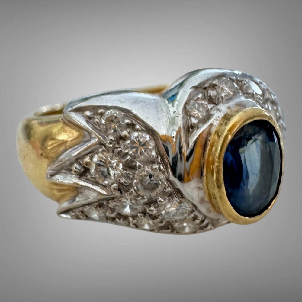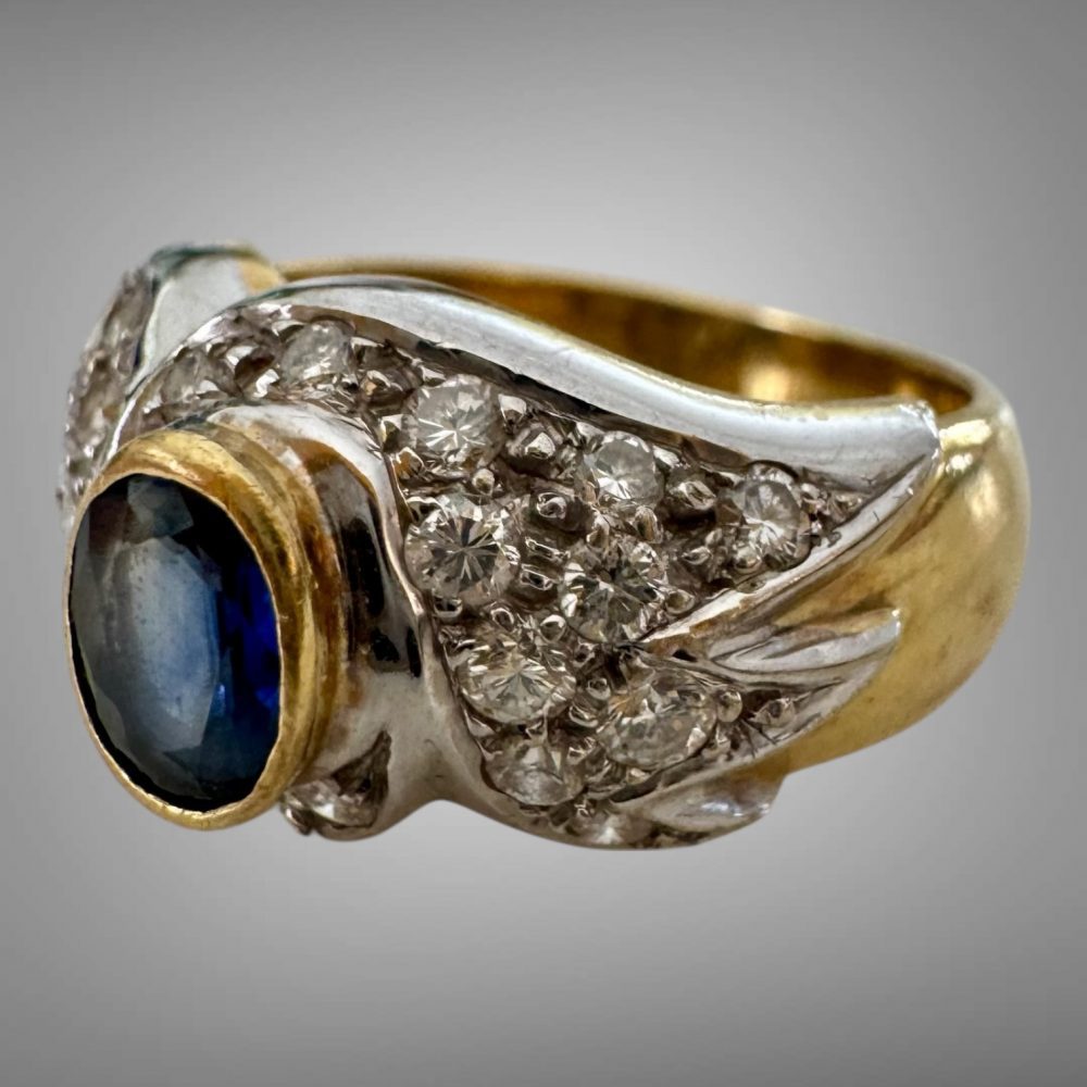This ring features an oval-cut blue sapphire as the center stone, surrounded by multiple smaller round brilliant-cut diamonds.